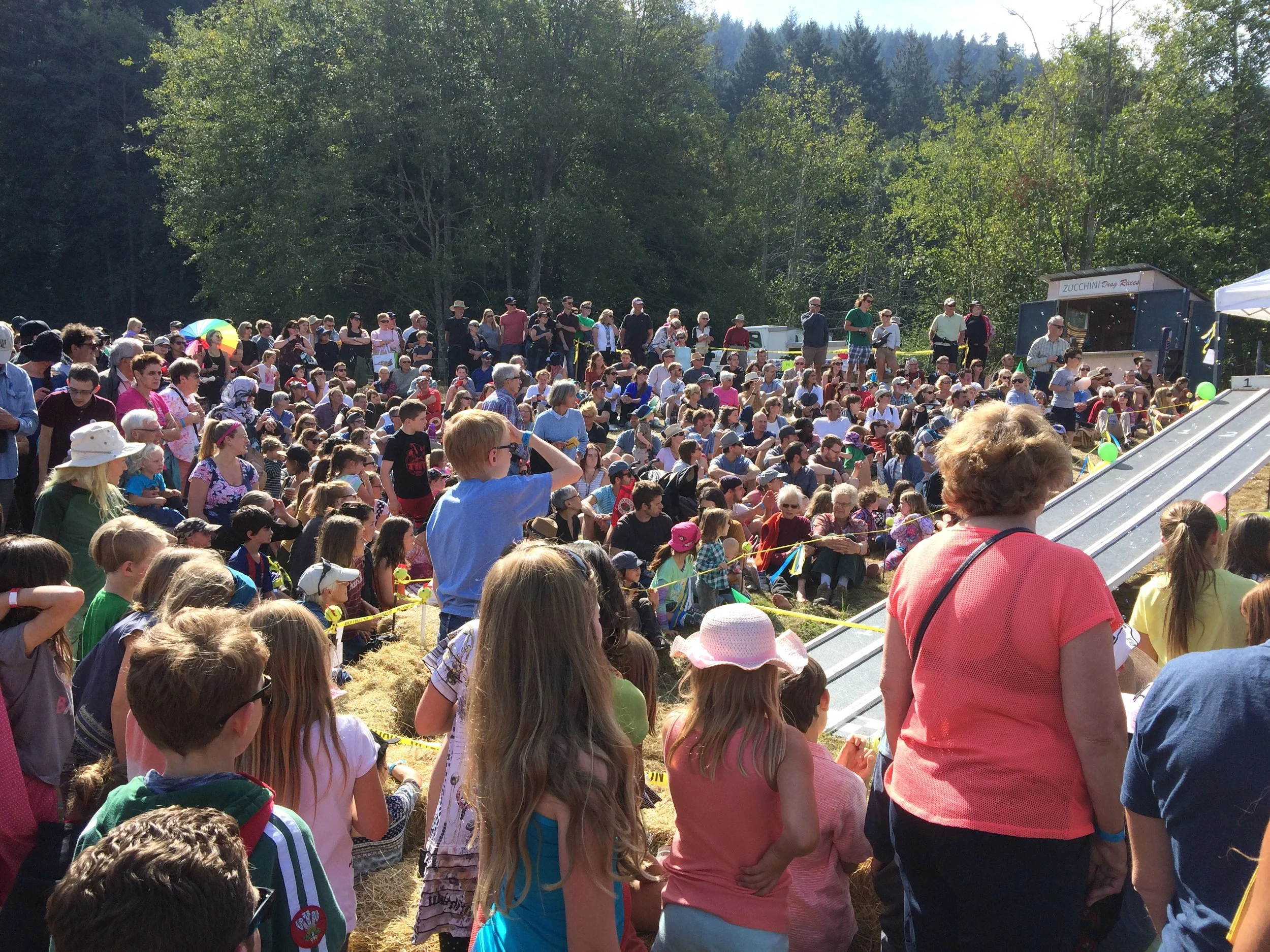When the zucchini race is announced, hundreds of people flock to the field where a long track, divided into 3 paths, is set up. The MC talks up the entries and the audience counts down. Then the flying machines are released! Some fly down, actually get airborn at the end of the ramp and fly into the waiting haybales like racecars. Other get… well, side tracked. Or give up all together. Sometimes the wheels come off. But everyone cheers. The fastest zucchini get a ribbon. And the crowd loves it.