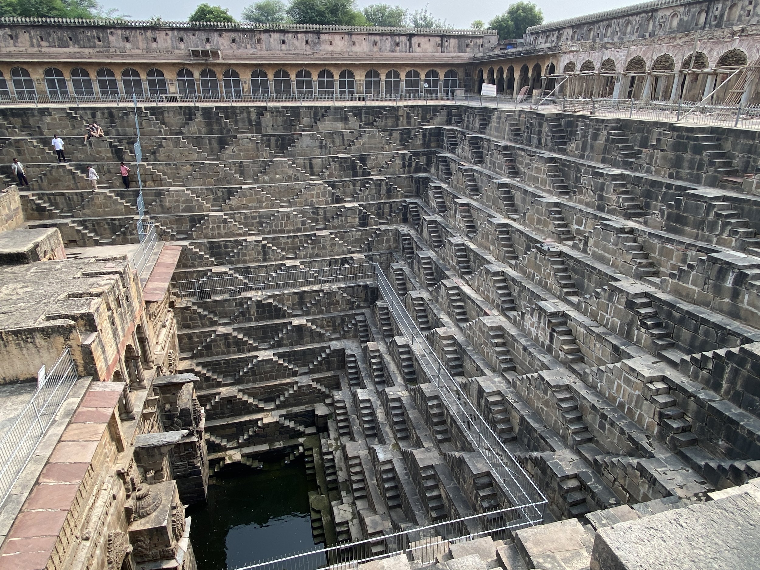 After yet another few hours driving along quiet roads, we reached another unesco World Heritage site and architectural wonder: Chand Baori in the village of Abhaneri is the most famous stepwell in Rajasthan. A stepwell’s purpose was to conserve a massive amount of rainwater during the monsoon season and thus provide a reliable, year-round water source for the local community in an region prone to drought. Because of the depth, the water stayed cool. This stepwell is dated to the 8th or 9th century, its oldest parts might date back to the 6th century CE.