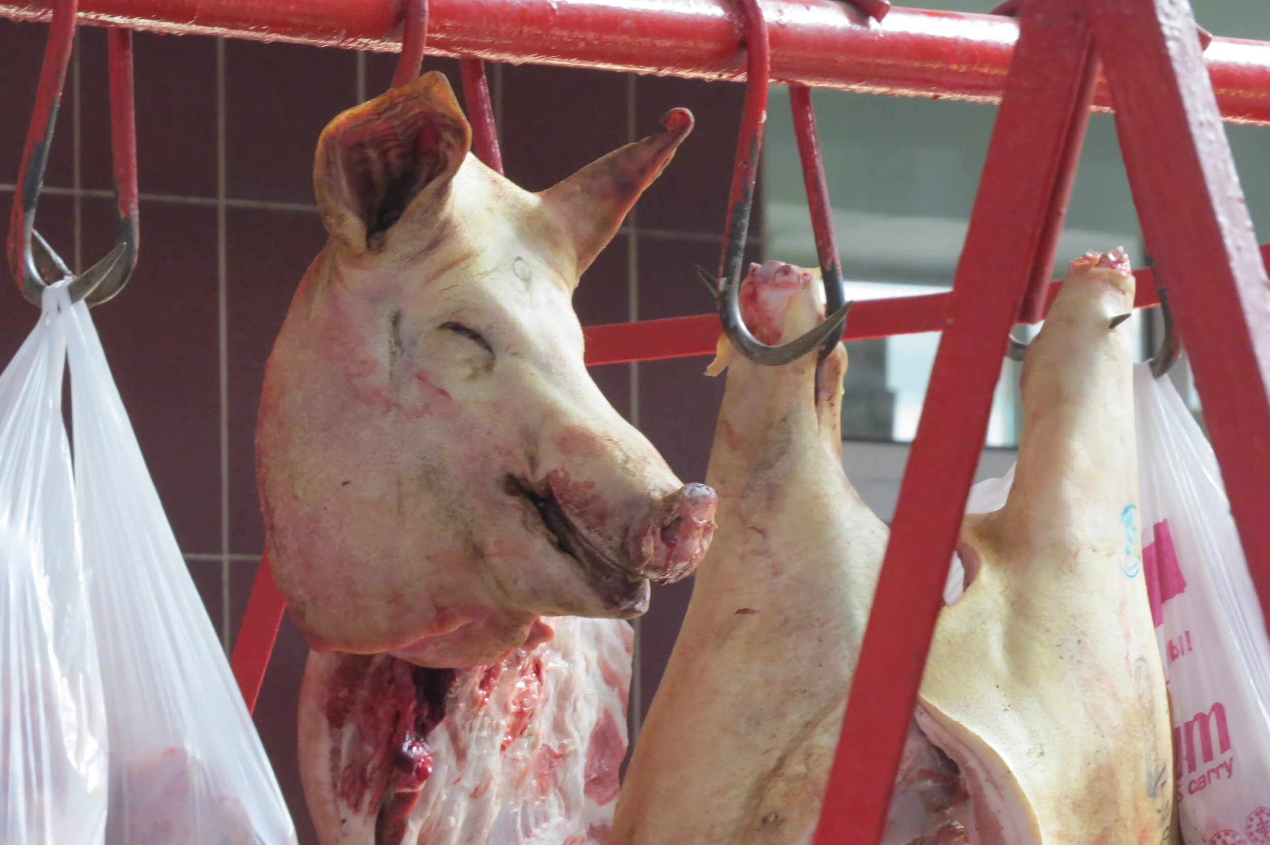 Then we descend the stairs to the indoor market and are enveloped in an exotic, foreign world. The food market! Along the stairs are warm breads and fresh eggs for sale, displayed on the stone steps. On the huge trade floor are nothing but rows and rows and rows of tables with fresh food: meat in every possible size and shape. An entire pig’s head grins at me. One table has a display of sheep heads, teeth and everything in tact. I spot a row of tongues dangling off a rod. Huge roasts, horse meat, camel meat. Then fish. And poultry.