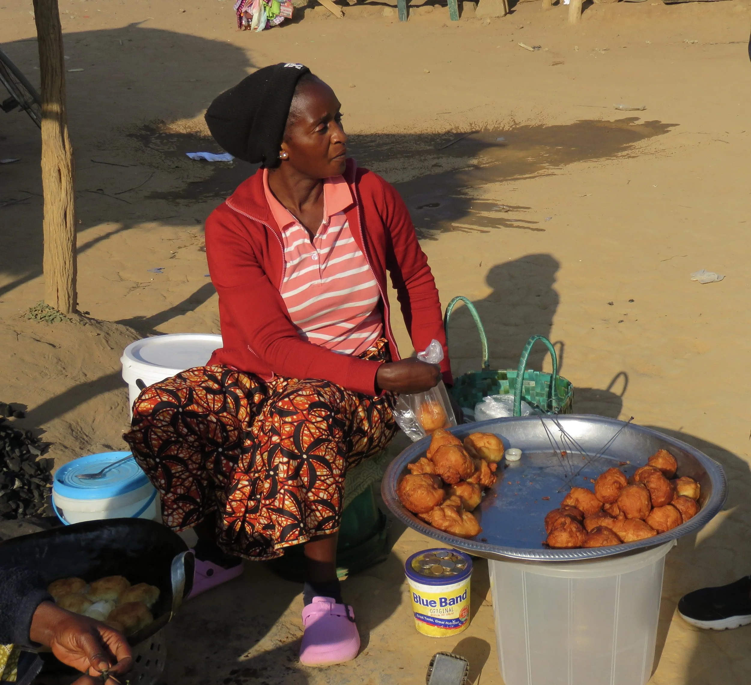 All the stalls are lashed together branches with thatched roofs. Women mostly sit on the ground with their wares: tasty fried fritters, fish, vegetables, tomatoes, fabric, tools, clothing, etc. etc. We seem to be the talk of the town. We’re basically the only white people everywhere we go. We, in turn, love seeing the proud tall women with straight backs, carrying babies and baskets and bags. The men are notoriously absent from the hustle and bustle of the market.