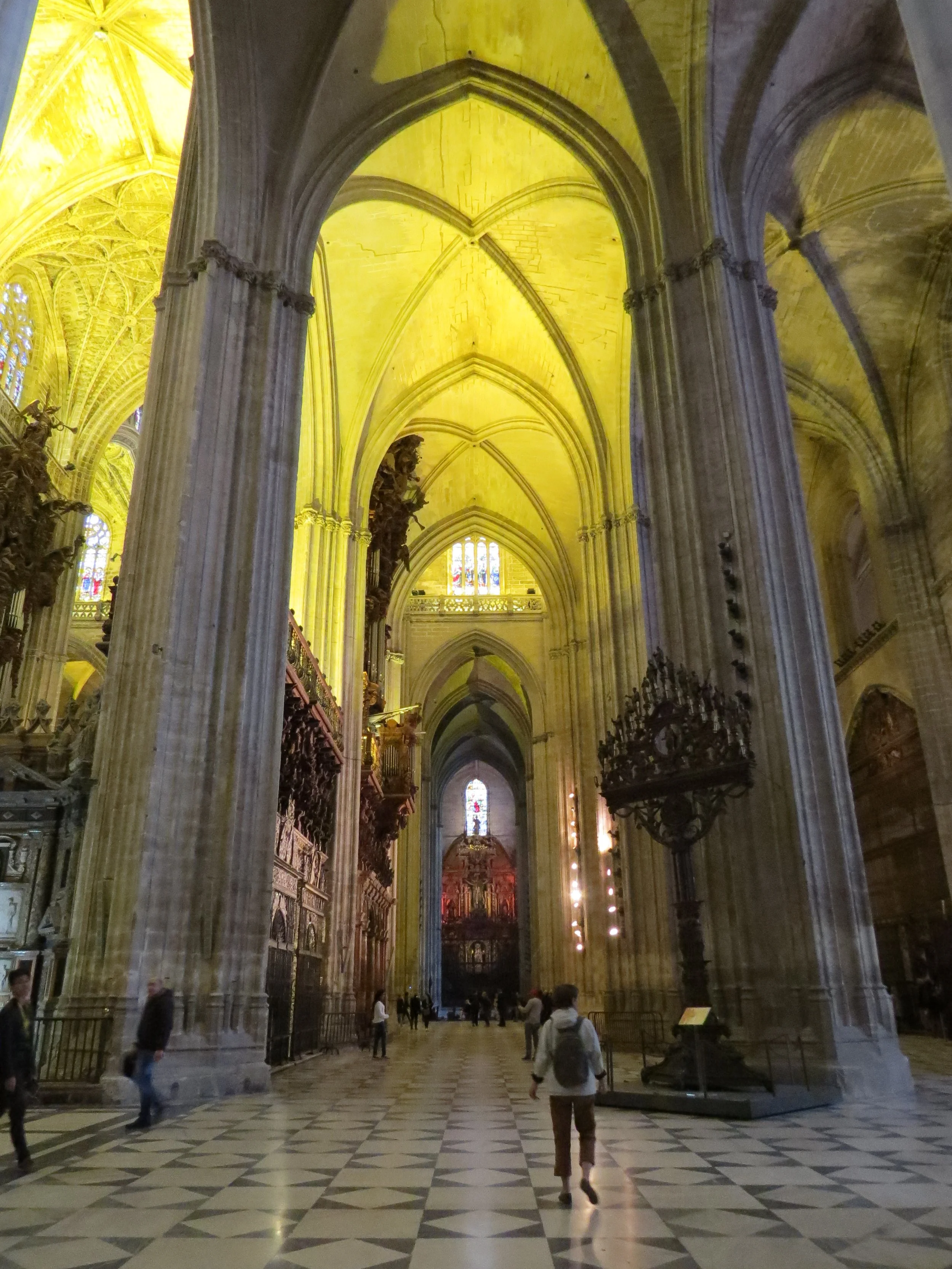 We also found the famous Cathedral of Seville. Build on the 12th century site of a Moorish mosque, this is the 3rd largest church in the world. Its construction took place from 1401 to 1506. Size and age alone were impressive enough. We walked its cavernous spaces, the ship of the church, admiring the side rooms full of art, paintings and carvings….